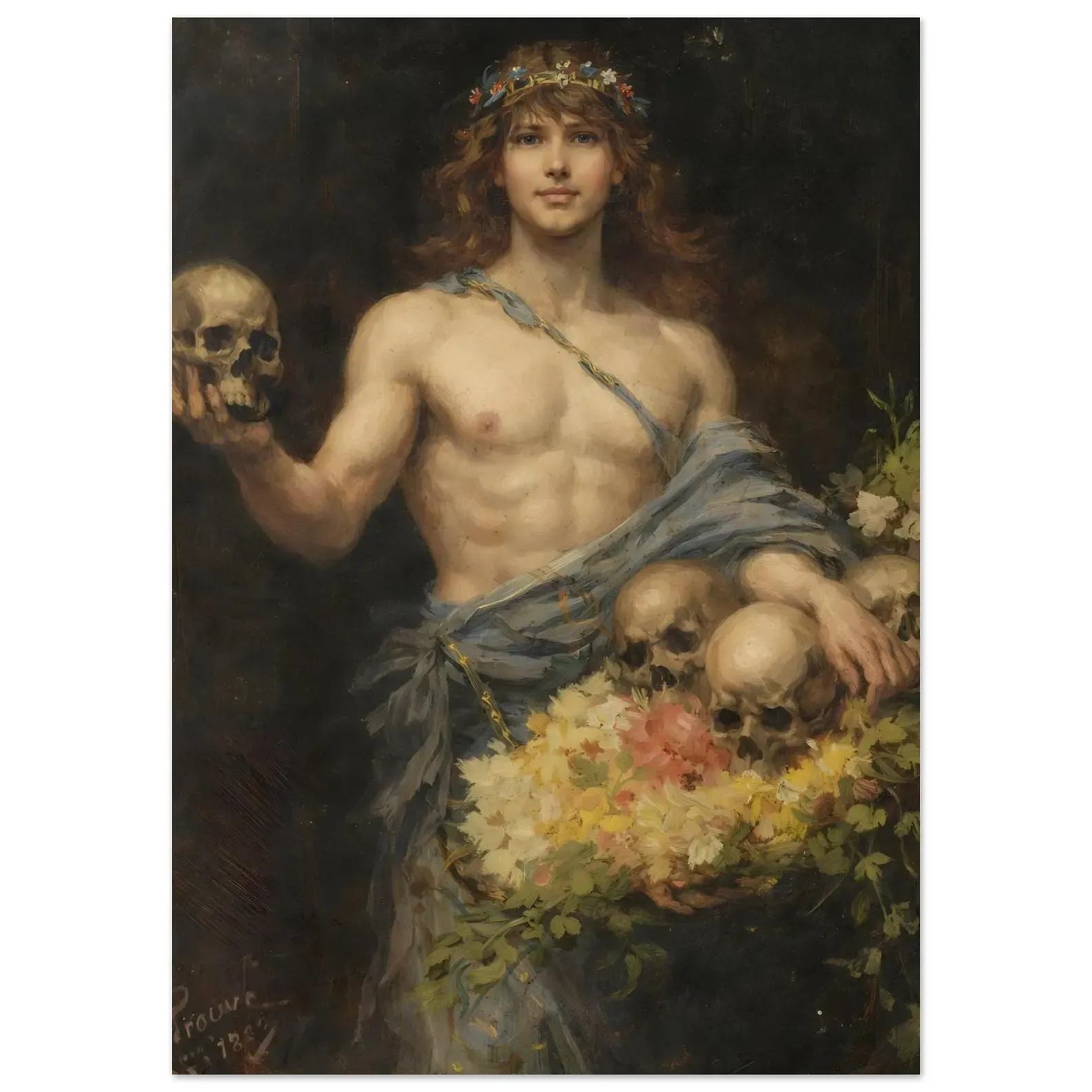 Based on The Flower Vendor (1882) by Victor-Émile Prouvé, this piece keeps the original’s lush symbolism but strips away its moral distance. Flowers and skulls still speak of impermanence, but the figure no longer performs innocence or warning. He stands present, embodied, and fully aware of his own beauty.