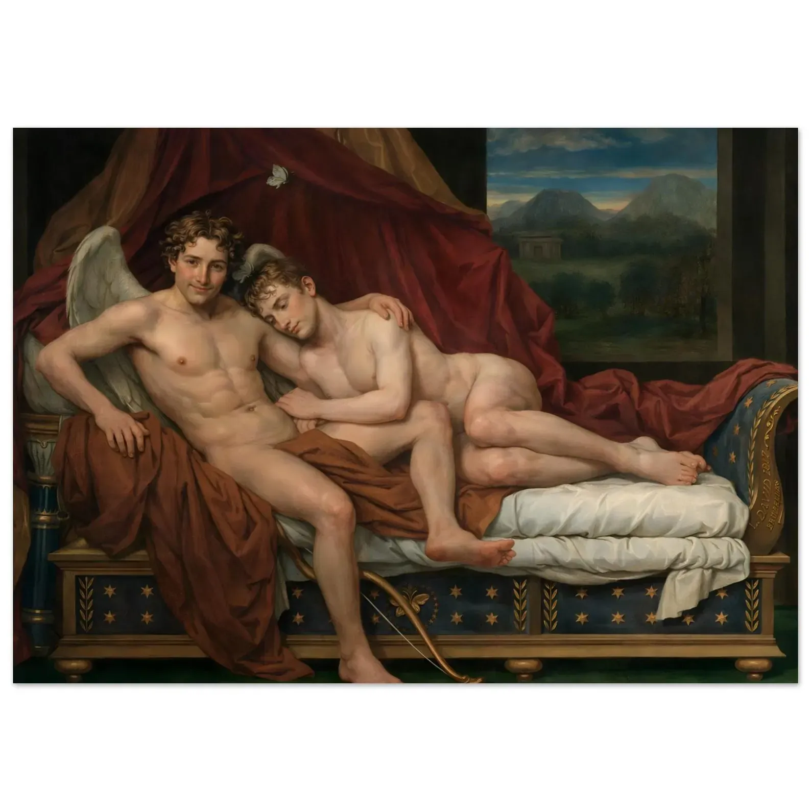 Inspired by Jacques-Louis David’s Cupid and Psyche, the original hanging in the Cleveland Museum of Art, this version shifts the myth into something quieter and more intimate. Love here is not theatrical or divine. It’s relaxed, mutual, and human. Two men at rest, choosing each other without spectacle.