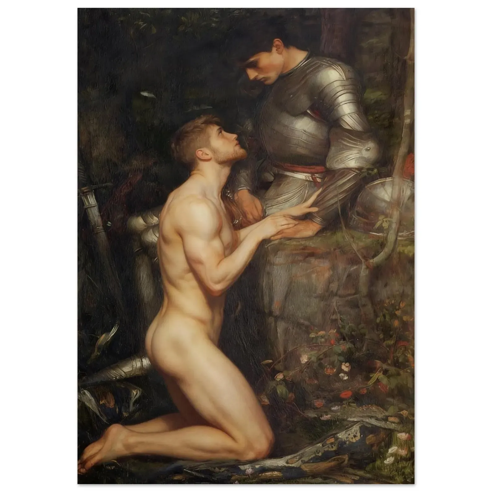 A reinterpretation of John William Waterhouse’s Lamia and the Soldier (1905), this piece leans into tension and desire rather than warning. Armor gives way to skin. Power becomes negotiable. The moment is charged, suspended between surrender and control.