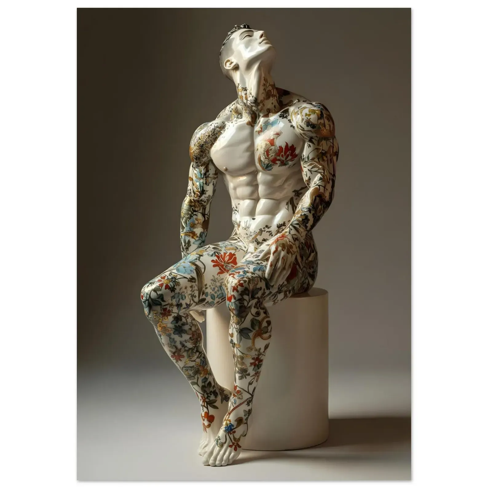 A seated male nude, polished and unguarded.