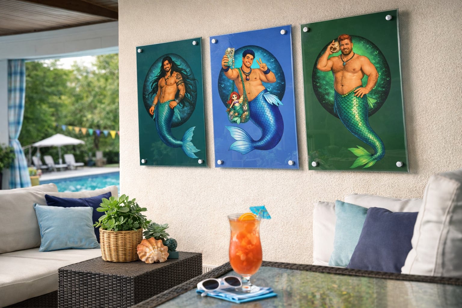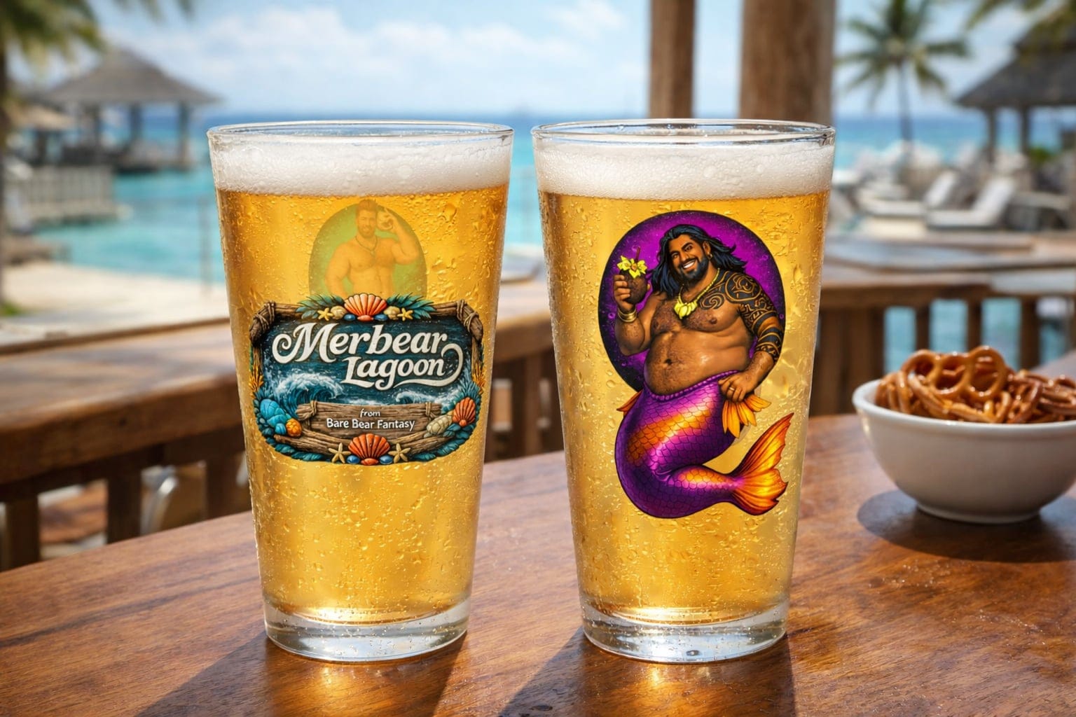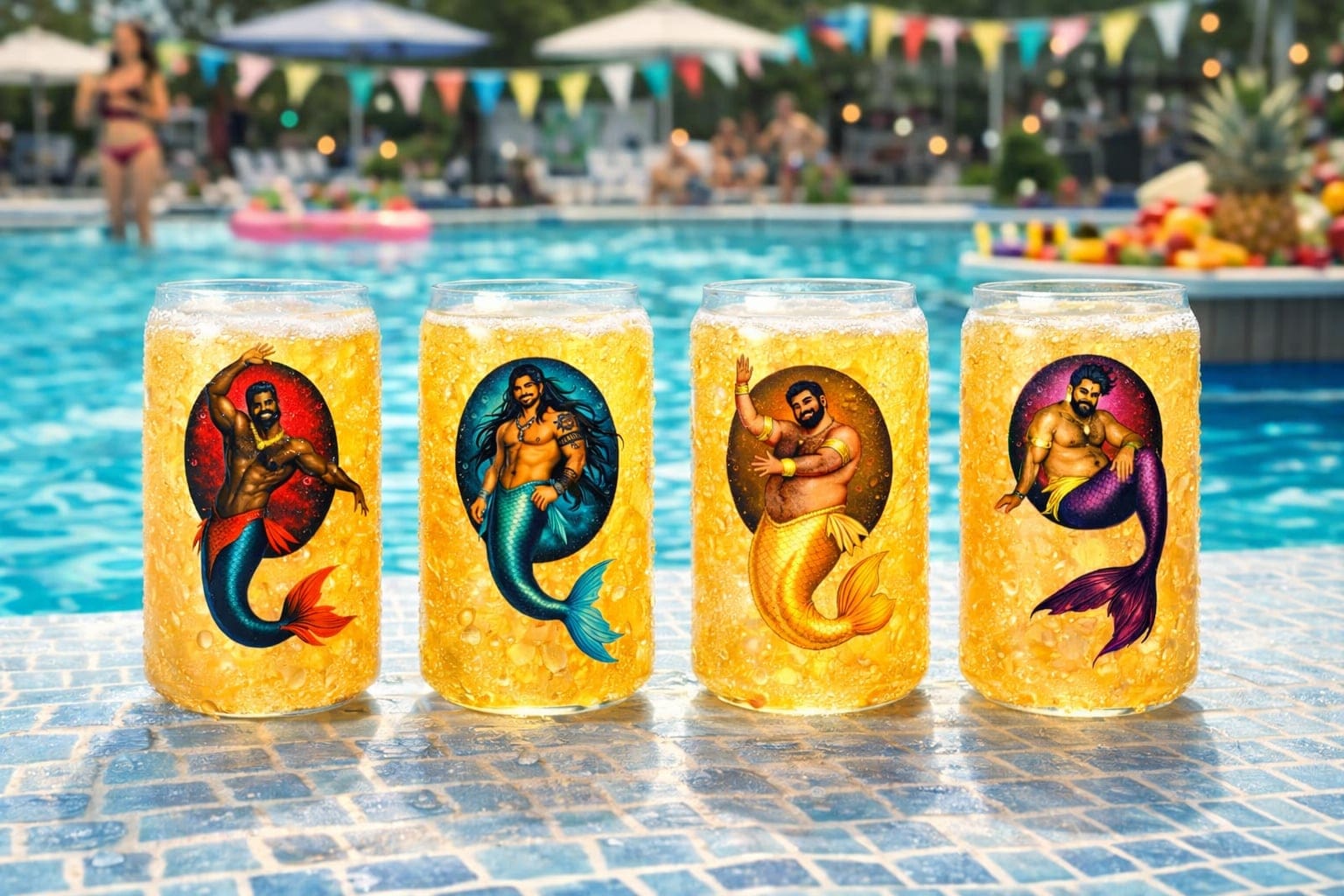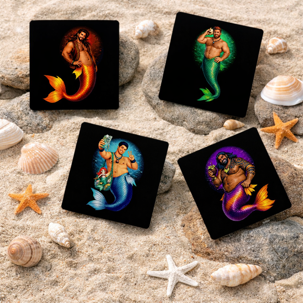 We even have the Merbears in two collections of 4 images each on can glasses, a sturdy 16 oz glass boasting a unique shape that mimics the design of a classic beverage can, also customizable - a great gift idea!