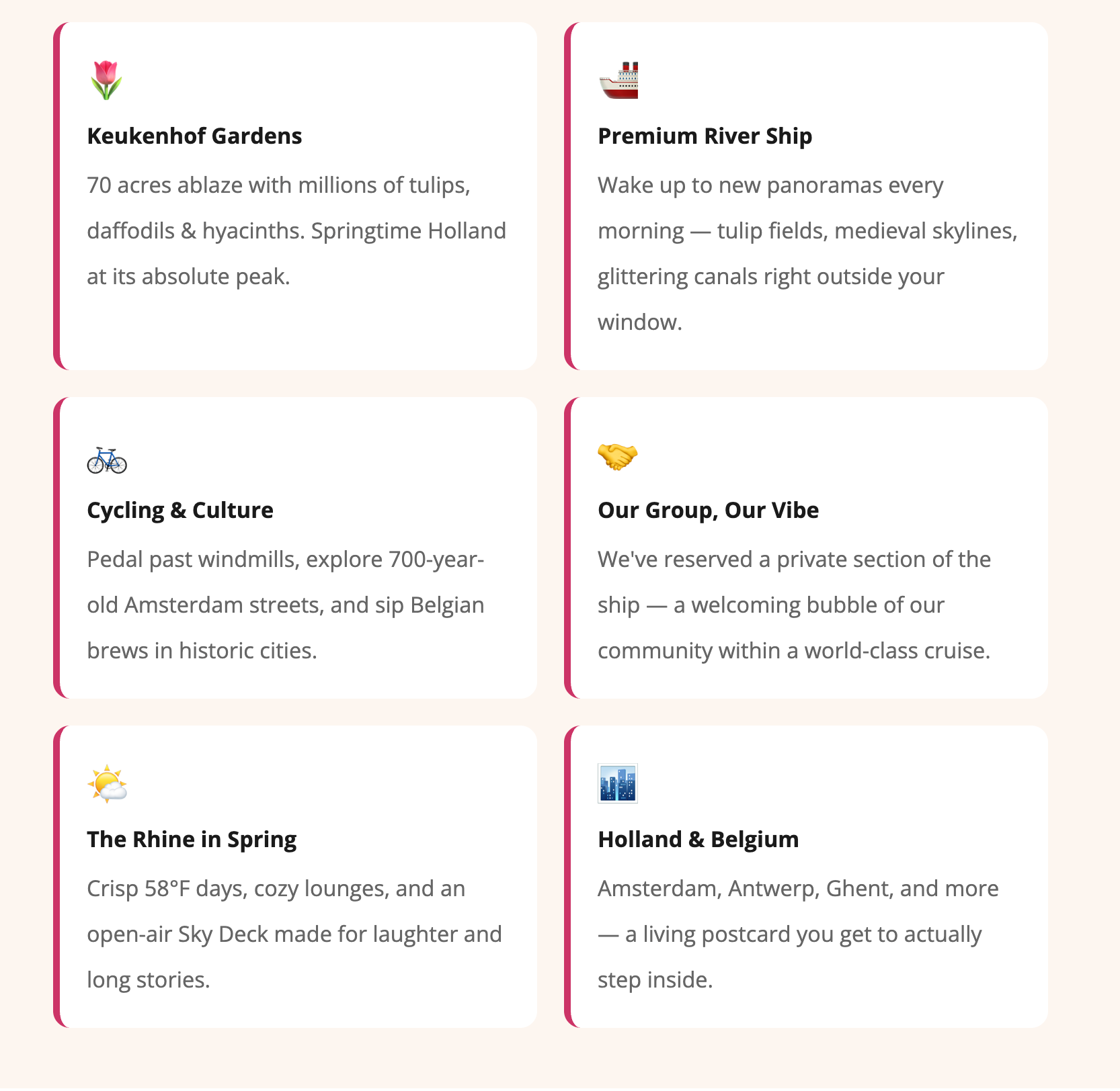 Expect great food, flowing wine, spontaneous conversations in the lounge at midnight, and the quiet magic of watching a foreign country drift past your porthole while you sip your morning coffee. This is a trip you'll be telling stories about for years.