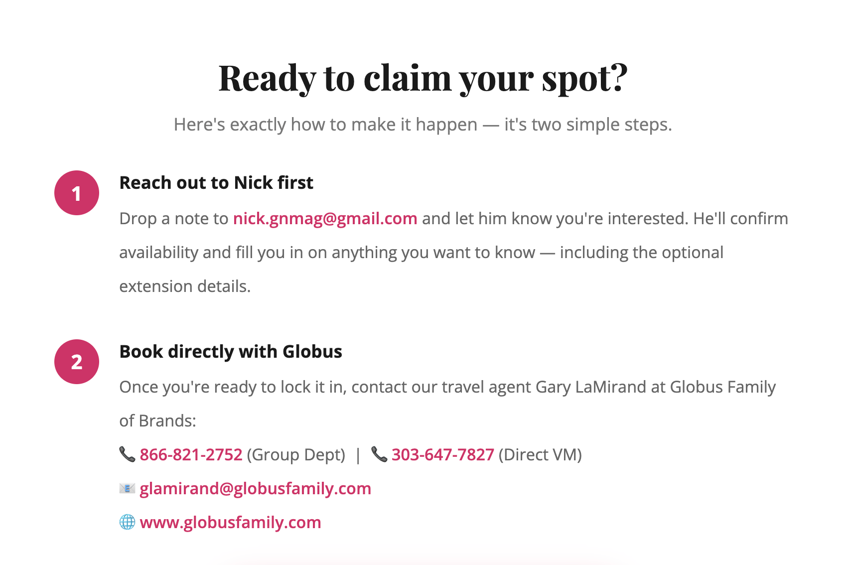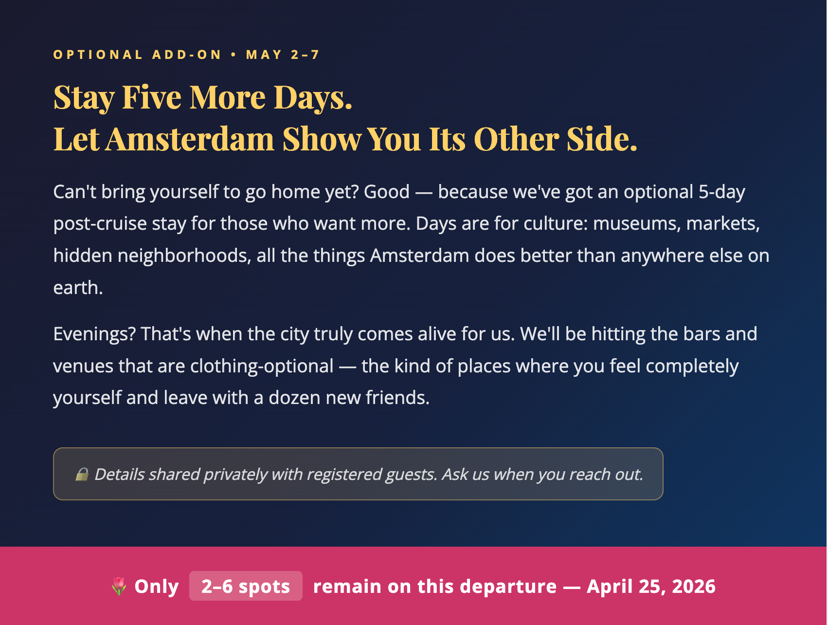 We set sail from Amsterdam on April 25th. That's 17 days from today. Between 2 and 6 spots are available. This email is going to a very short list of people — because we'd rather you hear about it first than miss it entirely.
